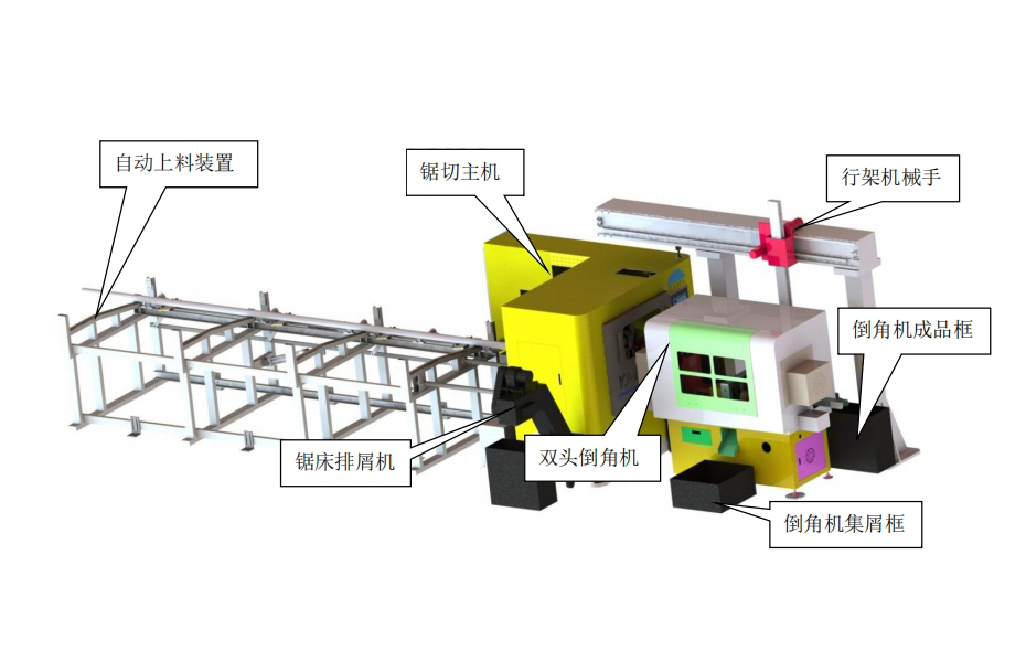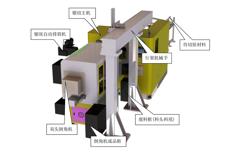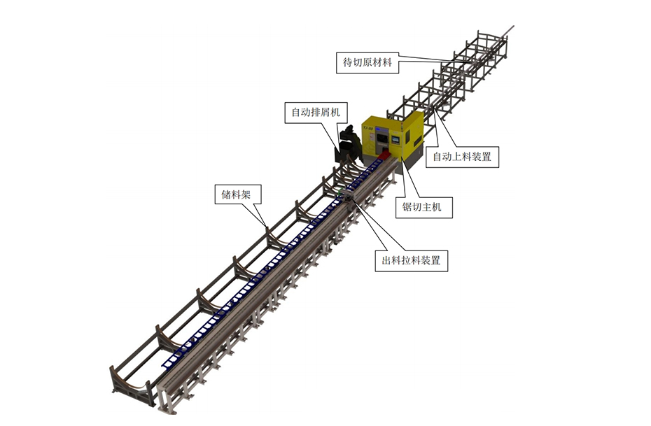 用于特定的異形零件鋸切,機械手自動上下料,主機鋸切完成送料、定位、出料及排屑等功能,無人看管。