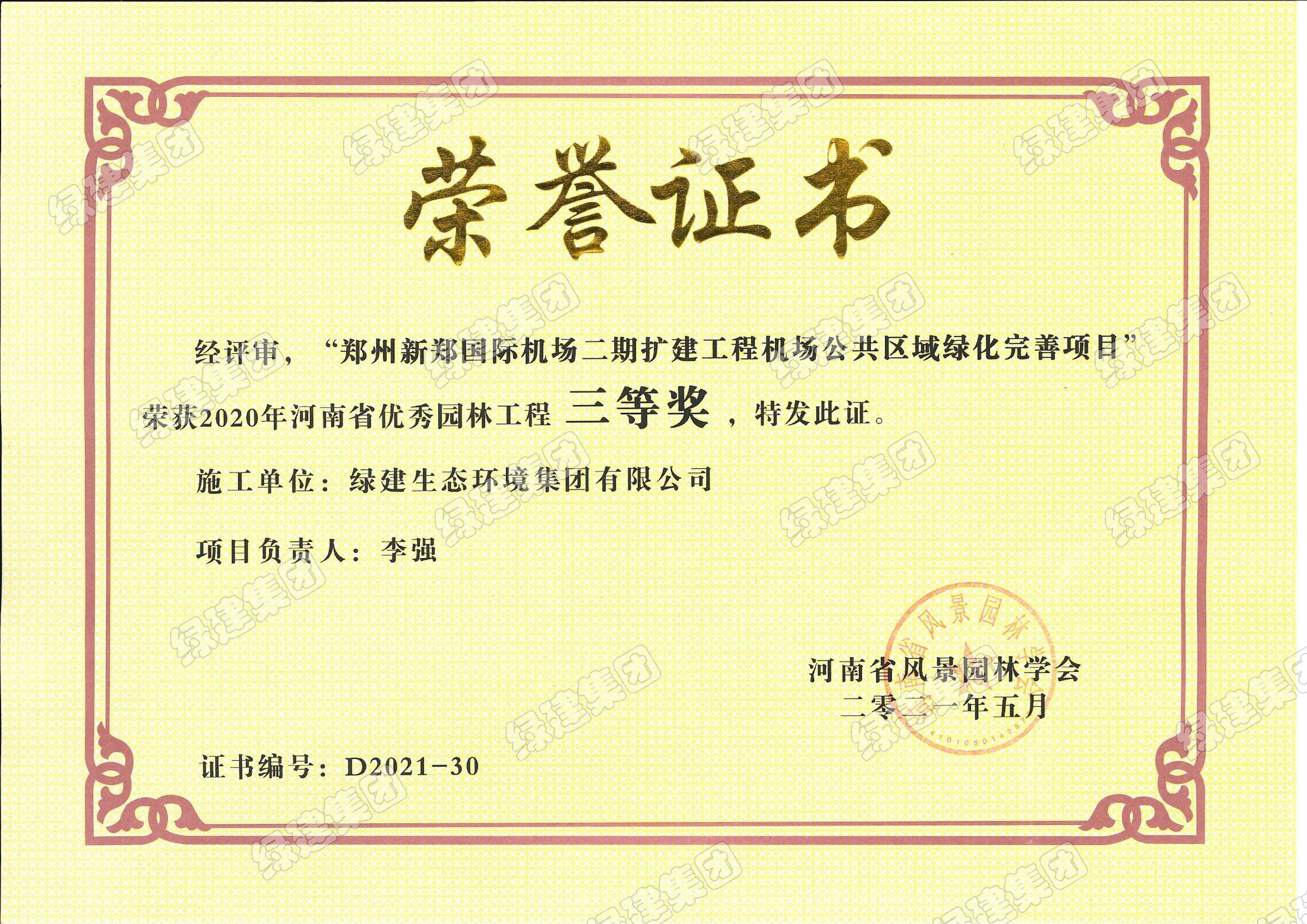 鄭州新鄭國際機(jī)場二期擴(kuò)建工程機(jī)場公共區(qū)域綠化完善項目——2020年河南省優(yōu)秀園林工程三等獎